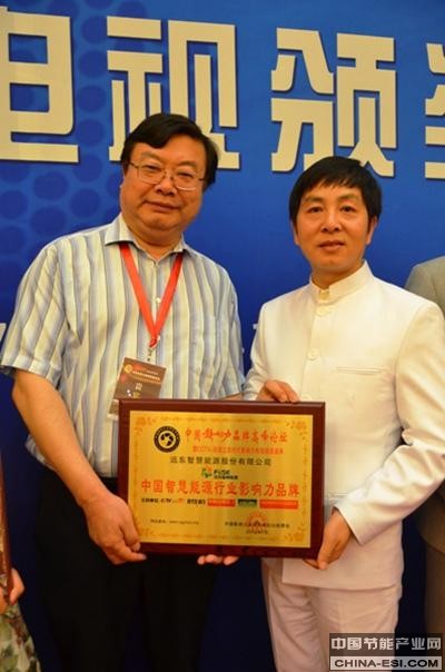 CCTV-发现之旅《时代影响力》栏目总制片人袁源(右) 为远东智慧能源颁奖   龚苗林(左)代表远东上台领奖