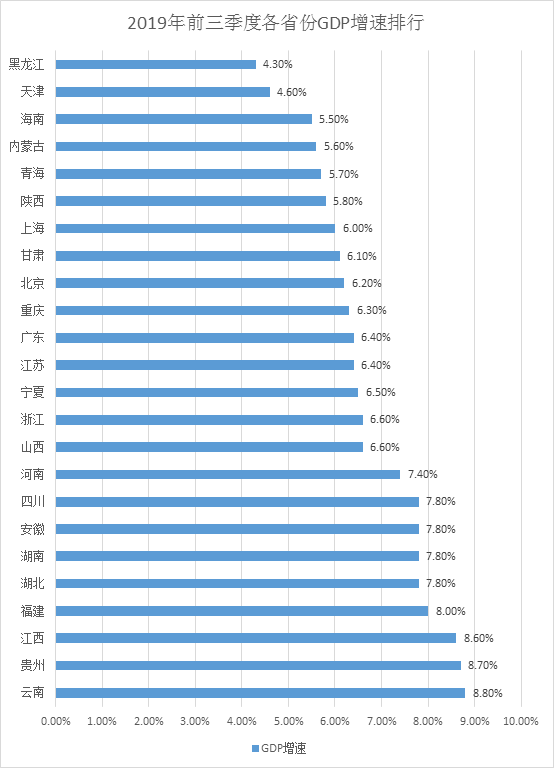 天津和黑龙江前三季度GDP增速排名末尾。其中,黑龙江增速为4.3%,暂时垫底。天津前三季度经济增速为4.6%,与今年上半年经济增速持平,排名倒数第二。