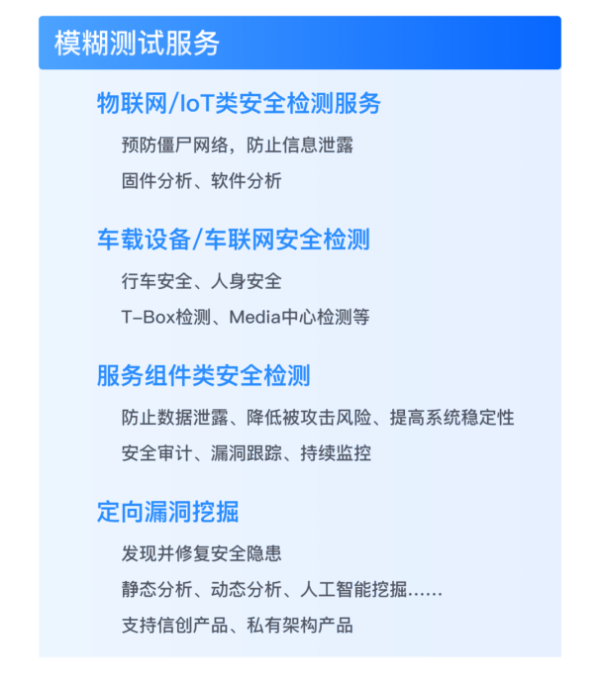 依托服务团队十余年安全行业的经验积累,云起无垠为企业带来了创新性的智能模糊测试服务,其中涵盖物联网/IOT类安全测试服务、车载设备/车联网安全检测、服务组件类安全检测及定向漏洞挖掘服务,帮助企业构筑更完善的安全防线,提供更全面的安全解决方案。