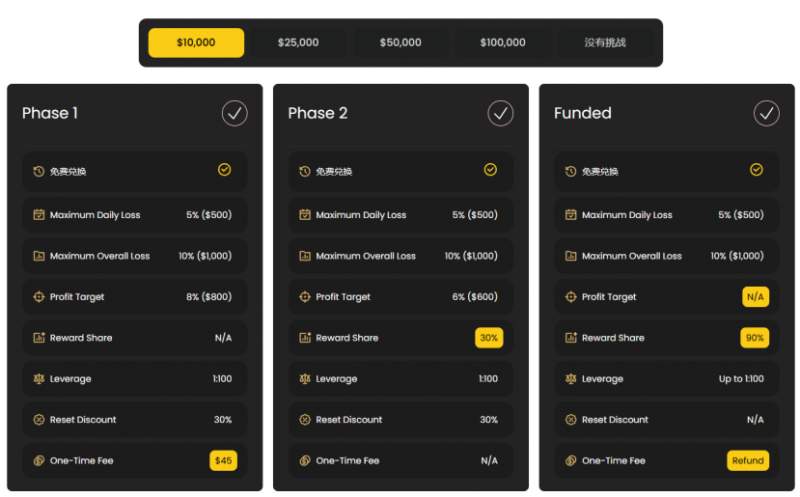 2.选择适合自己的模拟账户。新手选挑战账户,低至45美元起,完成专业技能评估和稳定性评估两个阶段的考核,就能解锁10000美元的模拟账户,达标后还能获得最高90%的交易绩效分成;有经验的交易员选择即时账户,不用评估,直接开启训练。