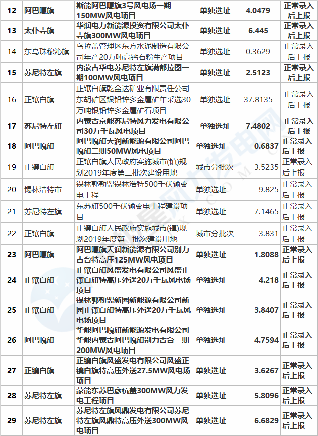 分别为:内蒙古华电金山锡盟苏尼特左旗225MW风电项目、深能北方(锡林郭勒)能源开发有限公司镶黄旗德斯格图400MW风电场项目、斯能阿巴嘎旗3号风电场一期150MW风电项目、华润电力新能源投资有限公司太仆寺旗300MW风电项目、内蒙古华电苏尼特左旗满都拉图一期100MW风电项目、内蒙古京能苏尼特风力发电有限公司30万千瓦风电项目;