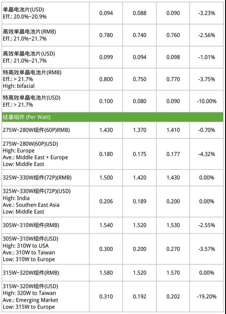 单晶电池片部分,头部企业六月份订单已签订,产能较紧,因此订单议价不受影响;议价能力较弱的二三线厂,六月份订单议价能力弱,报价明显松动,电池片价格仍持续调降。