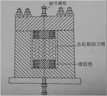 在齿轮箱支撑两端各有一个调节装置,通过调整螺栓可实现对齿轮箱安装高度的微调,以避免系统出现过约束,使齿轮箱与主轴连接处受附加弯矩的作用。同时叶可以调整减振支撑整体的刚度性能以实现风机的变刚性设计。这种齿轮箱弹性支撑具有出色的阻尼及减振性能,可大大减少结构噪声的传递,承载大且安装方法简单,更换方便。
