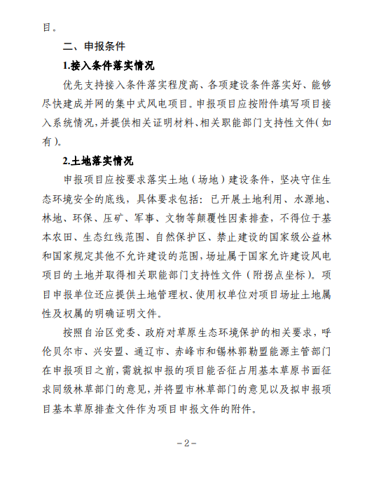 为保障项目尽快开工建设,请各盟市能源主管部门按照以下要求组织开展2021年集中式风电、光伏发电保障性并网项目的申报工作。