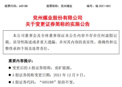 12月6日晚间,兖州煤业(600188.SH)披露,兖州煤业A股证券简称将于2021年12月9日变更为“兖矿能源”,A 股证券代码“600188”保持不变。