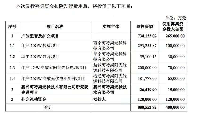 本次科创板过会,阿特斯将募集40亿元分别用于年产10GW拉棒项目、阜宁10GW硅片项目、年产4GW高效太阳能电池项目、年产10GW高效光伏电池组件项目,以及嘉兴阿特斯技术研究院的建设和流动资金补充。