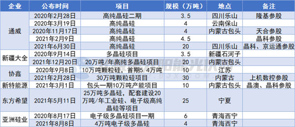与此同时,合盛硅业、信义光能&信义玻璃、江苏阳光集团等纷纷投掷出以10万吨起步的多晶硅扩产计划。据北极星太阳能光伏网统计,2020年至今,多晶硅新增产能规划已超200万吨。