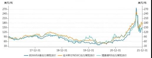 北半球进入冬季后,电力需求增加,国际市场供应偏紧。12月上中旬,国际动力煤价格见底反弹;12月下旬,价格出现分化,涨跌互现。欧洲ARA、理查德RB、纽卡斯尔NEWC三港价格12月31日分别报收于150美元/吨、130.58美元/吨、165.86美元/吨。2021年全球经济复苏带来的能源需求回暖,推动石油、天然气、煤炭价格一再走高。根据国际能源署数据,2021年,全球电力需求增长速度实际上远超可再生能源装机增速,2021年燃煤发电量甚至创下历史新高,全球动力煤价格亦于10月创出历史高位。