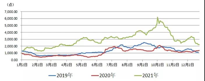 2021年12月,在政策导向、寒潮来袭和消费淡季预期等因素的影响下,大宗散货价格下跌,加之煤炭库存较好,下游囤货热情降温,市场采购需求减少,沿海散货运输市场货少船多,运输需求低迷,运价不断下跌。2021年12月30日,海运煤炭运价指数OCFI报收于779.18点,已接近2019年同期水平,较11月底下跌千点有余,跌幅达57%,较2020年同期下跌40.5%。